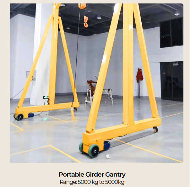 Lightweight and mobile gantry cranes designed for flexible lifting operations. Easy to assemble and move, these gantries are ideal for workshops, maintenance tasks and small industrial applications requiring quick setup and efficient handling.